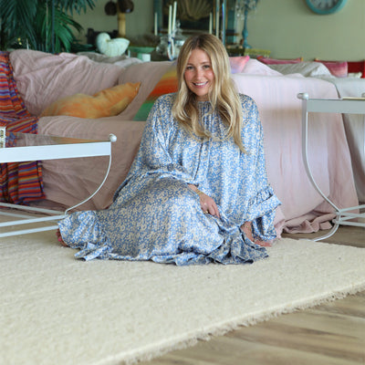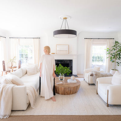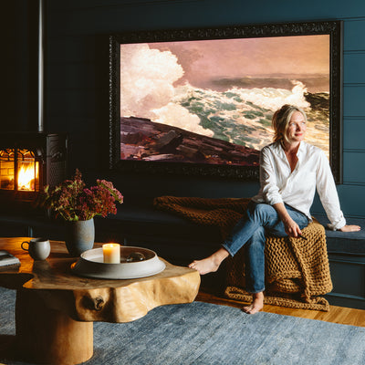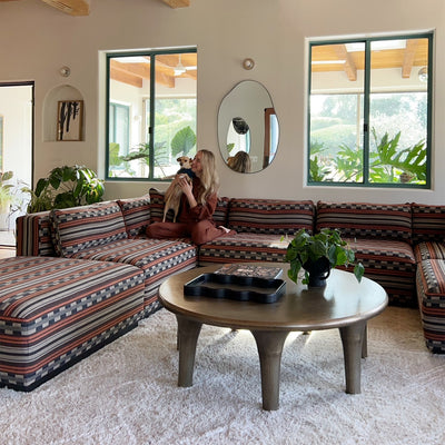 Creative entrepreneur Marta Mae Freedman’s oceanfront Malibu home embodies her eclectic collector-style, featuring the cozy Leru Rug. This space, filled with vintage touches and personal memories, creates a warm and inviting atmosphere perfect for relaxation and hosting loved ones.